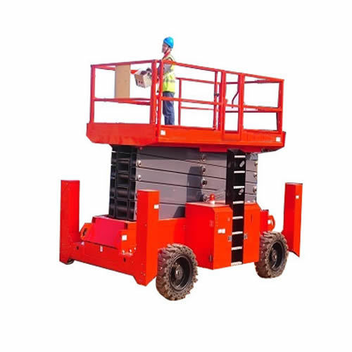 自動調平液壓支腿、雙滑移平臺(1.2米)、無痕跡粗糙地面輪胎、擺動軸、直流動力源、空氣管接至平臺
